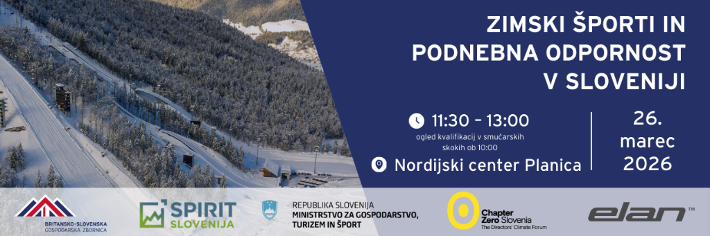 Javna agencija SPIRIT Slovenija v sodelovanju s programskim partnerjem Britansko-slovensko gospodarsko zbornico vabi na Čaj z razlogom o prihodnosti zimskih športov in podnebni odpornosti v Sloveniji, ki bo potekal ob robu svetovnega pokala v smučarskih skokih FIS v Planici.