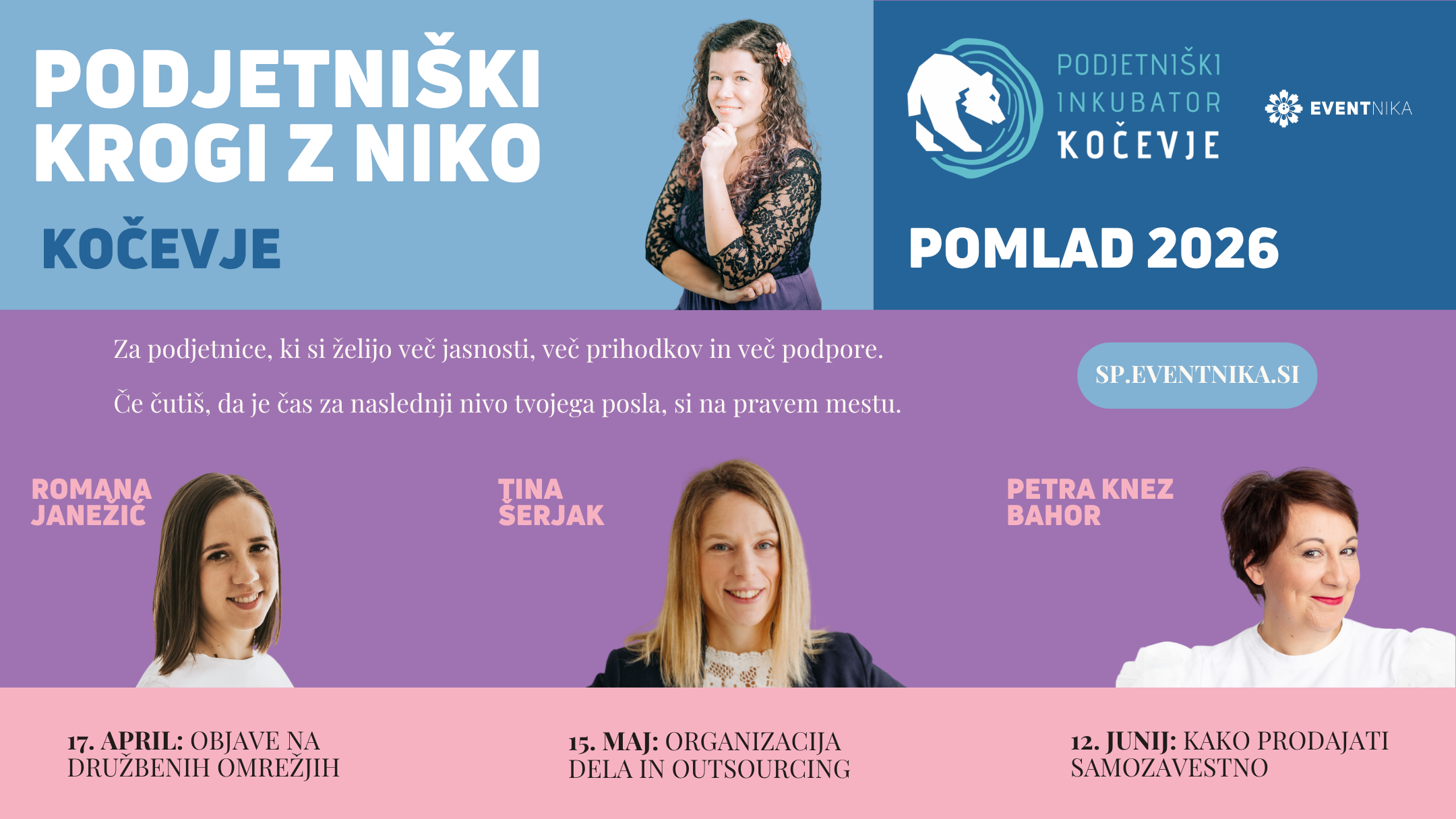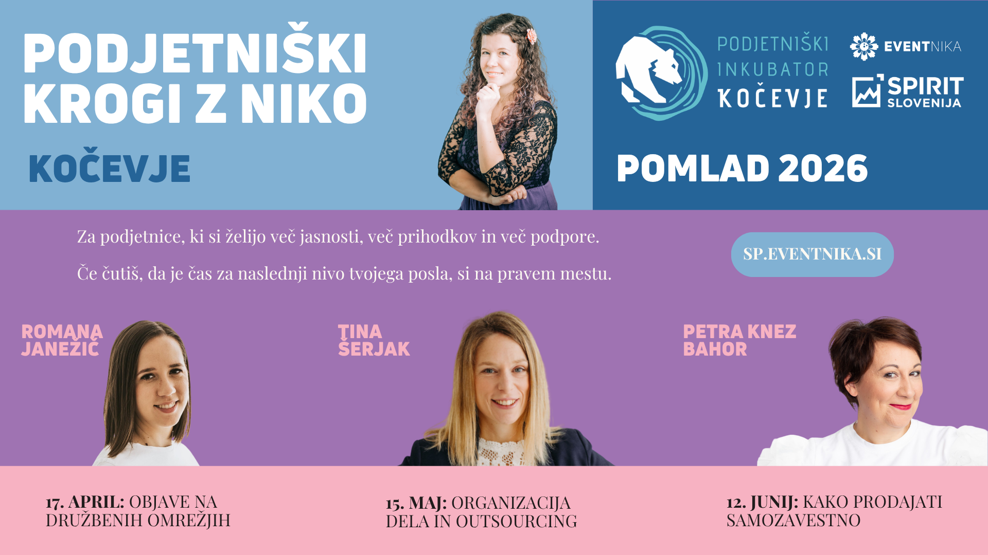 Program vodi Nika Močnik, podjetnica, mentorica organizatorkam dogodkov in podjetnicam, ki s kočevskim inkubatorjem sodeluje že približno deset let. V tem času je pri njih predavala o različnih podjetniških temah, med drugim o davkih, javnem nastopanju in pripravi pitchev. Tokrat pa v Kočevje prihaja z novim, bolj celostno zasnovanim programom za podjetnice, ki želijo svoj posel voditi bolj jasno, bolj samozavestno in z več strukture.