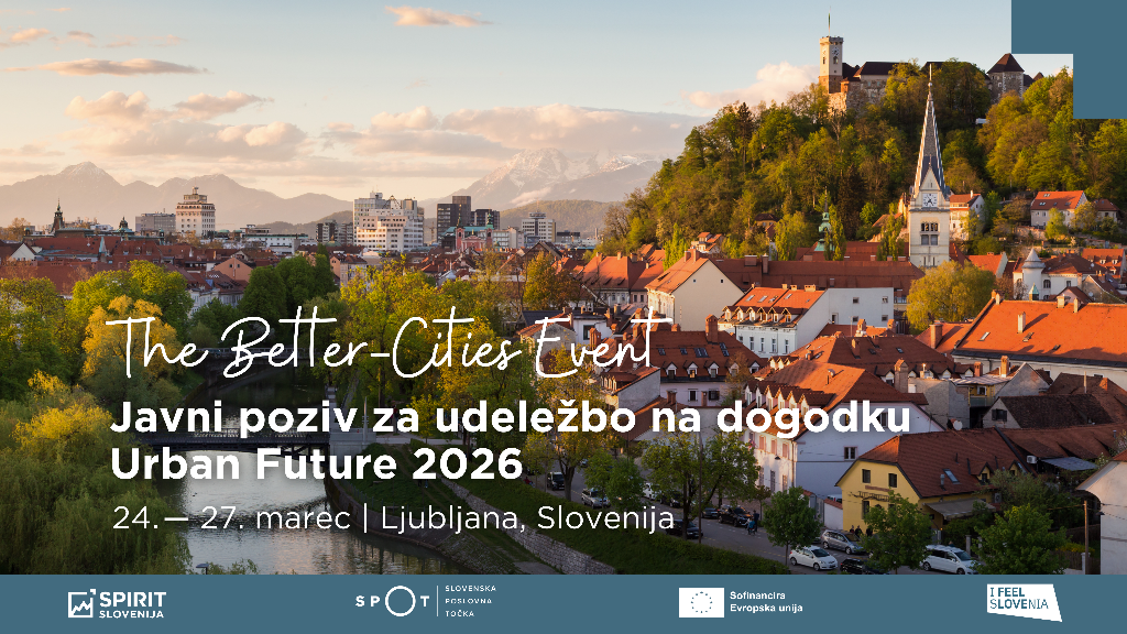 SPIRIT Slovenija v okviru partnerstva z mednarodno konferenco Urban Future 2026 (v nadaljevanju: UF26) vabi inovativna slovenska podjetja, da se prijavijo k sodelovanju v slovenski podjetniški delegaciji, ki bo potekala od 24. do 27. marca 2026 na Gospodarskem razstavišču v Ljubljani.