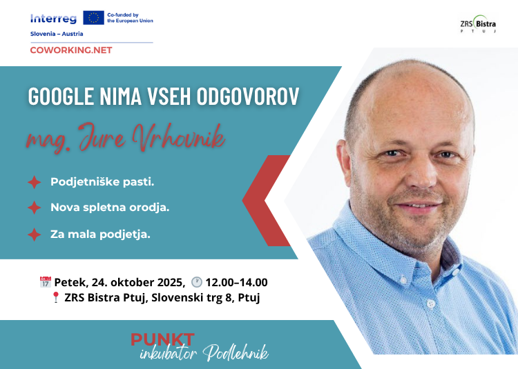 Vabljeni na brezplačno predstavitev z naslovom: »Ko Google nima vseh odgovorov - podjetniške pasti, kako jih prepoznati in se jim izogniti!«, ki bo potekala 24. oktobra 2025, ob 12.00 uri v prostorih ZRS Bistra Ptuj (sejna soba, 1. nadstropje), Slovenski trg 8, Ptuj.