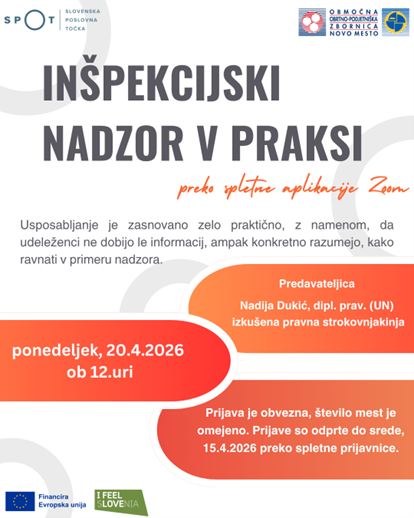 • Brezplačno spletno usposabljanje “Inšpekcijski nadzor v praksi” bo 20. aprila 2026, ob 12.00 uri preko spleta (aplikacije ZOOM).